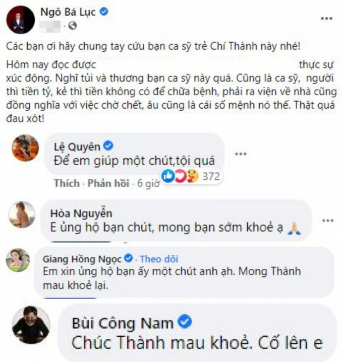Vào ngày 2/11 vừa qua, một người bạn thân của ca sĩ Chí Thành - học trò của Hồ Quỳnh Hương đã tiết lộ việc nam ca sĩ bị bệnh nặng, đang trong tình trạng nguy kịch và rất cần sự hỗ trợ đến từ các mạnh thường quân. Nhiều sao Việt ngay sau đó cũng đã chung tay giúp đỡ Chí Thành. Vài ngày sau, nam ca sĩ đã được người thân đưa vào bệnh viện để tiếp tục điều trị.