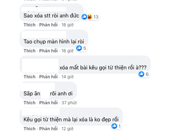 Thông tin trên ngay lập tức nhận được sự quan tâm của đông đảo khán giả. Nhiều người đã vào trang fanpage cá nhân của nam diễn viên để tìm kiếm thông tin bài viết, kiểm chứng sự thật. Trong bài đăng gần nhất trên Fanpage chính chủ của Anh Đức, rất nhiều dân mạng đang ùa vào yêu cầu nam diễn viên sao kê và thắc mắc về nguyên do anh xoá bài kêu gọi từ thiện.