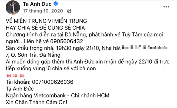 Tuy nhiên, sau khi “soi” lại dòng thời gian của Anh Đức, có thể thấy nam diễn viên vẫn chưa hề xóa bài đăng kêu gọi quyên góp hỗ trợ miền Trung. Điều này cũng khẳng định thông tin lan truyền trên MXH là hoàn toàn sai sự thật.