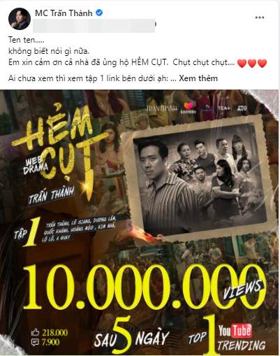 Mới đây trên trang cá nhân của nam MC Trấn Thành, anh vui mừng thông báo đến toàn thể người hâm mộ tin vui sau nhiều ngày chờ đợi. Theo đó Trấn Thành cho biết web drama Hẻm cụt của anh đã cán mốc 10 triệu view sau 5 ngày công chiếu.