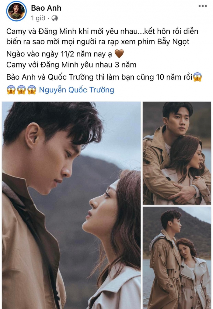 “Camy và Đăng Minh khi mới yêu nhau... kết hôn rồi diễn biến ra sao mời mọi người ra rạp xem phim Bẫy Ngọt Ngào vào ngày 11/2 năm nay ạ. Camy với Đăng Minh yêu nhau 3 năm. Bảo Anh và Quốc Trường thì làm bạn cũng 10 năm rồi Nguyễn Quốc Trường”.