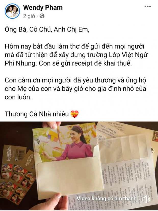 Hôm nay bắt đầu làm thơ để gửi đến mọi người mà đã từ thiện để xây dựng trường lớp Việt Ngữ Phi Nhung. Con cảm ơn mọi người đã yêu thương và ủng hộ cho mẹ của con và bây giờ cho gia đình nhỏ của con luôn.”