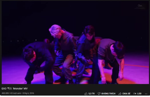 Thời gian gần dây, dù không có quá nhiều hoạt động nhưng EXO vẫn khiến cư dân mạng ngỡ ngàng khi đạt thêm thành tích “khủng” mà chưa nhóm nhạc nào của SM làm được. Theo đó, ca khúc Monster của nhóm chính thức cán mốc 400 triệu lượt xem trên Youtube, trở thành video thứ 2 của nhóm đạt được con số này.