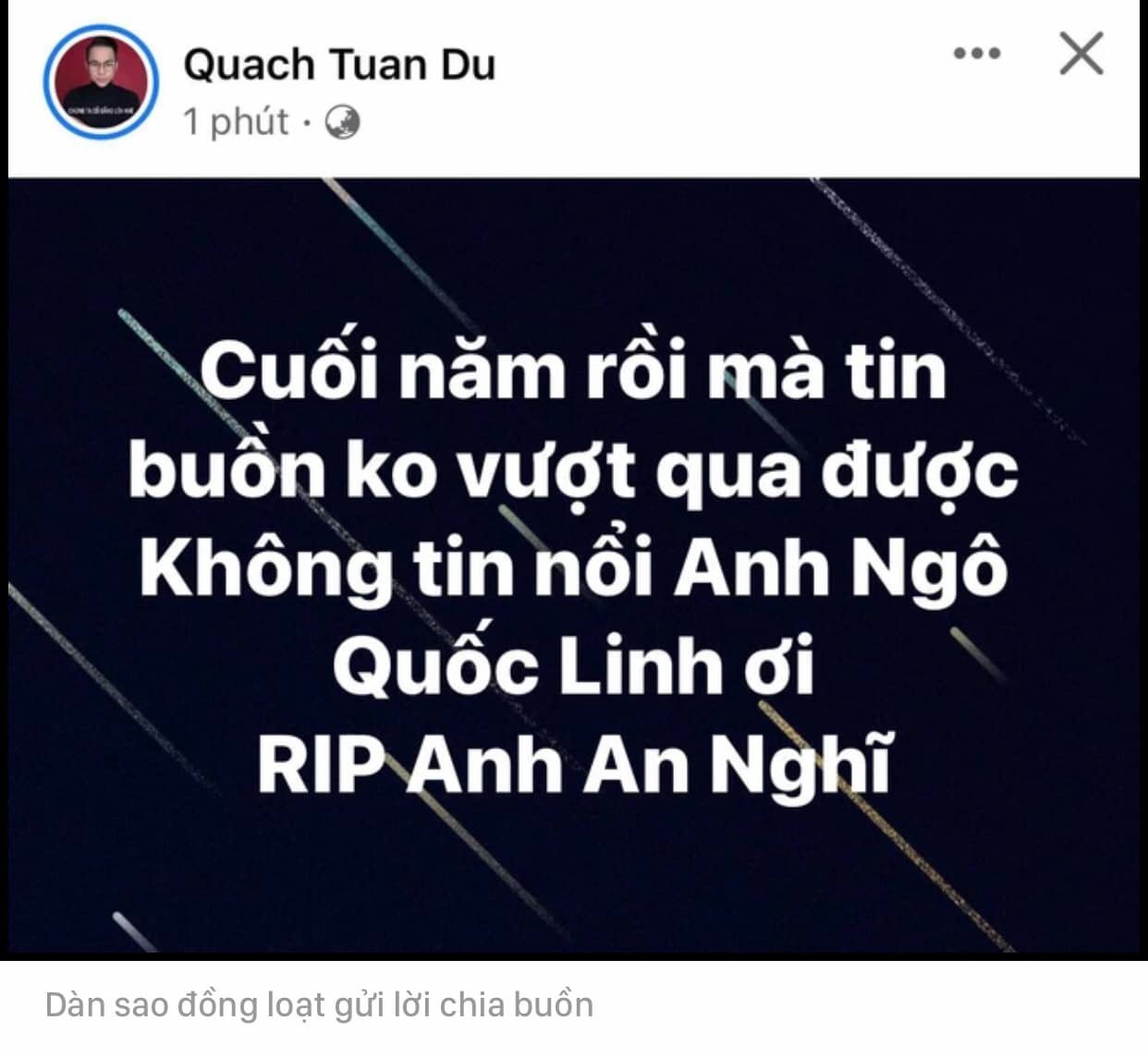 Lâm Khánh Chi không giấu nổi sự bàng hoàng, cô đăng trên trang cá nhân: VÔ CÙNG THƯƠNG TIẾC ANH NGÔ QUỐC LINH”. NS Bình Tinh gửi lời chia buồn cũng như lời tiễn biệt cuối cùng đến cố ca sĩ Ngô Quốc Linh.