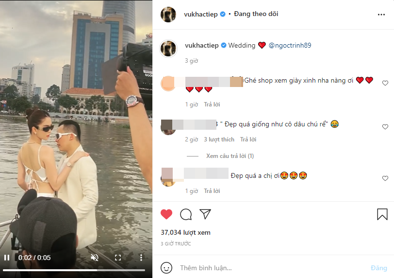 Trước đó vào tối ngày 4/12, Vũ Khắc Tiệp gây bão MXH khi chia sẻ clip quay cùng Ngọc Trinh kèm dòng trạng thái “Wedding”. Sẽ không có gì đáng nói nếu như dòng trạng thái của Vũ Khắc Tiệp được sử dụng theo cách đầy ẩn ý, nhắc đến chuyện đám cưới?
