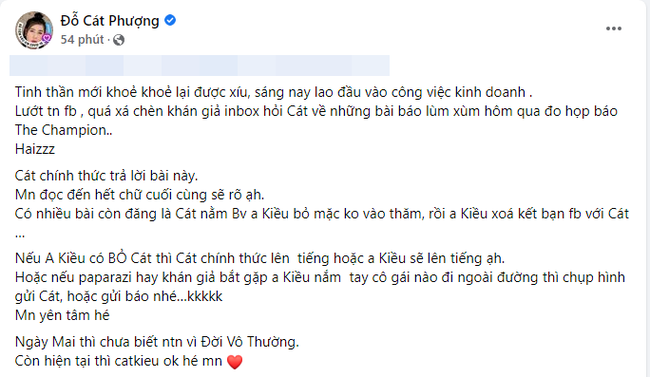 "Tinh thần mới khỏe lại được xíu, sáng nay lao đầu vào công việc kinh doanh. Lướt tin nhắn Facebook, quá xá chèn khán giả inbox hỏi Cát về những bài báo lùm xùm hôm qua đi họp báo The Champion.