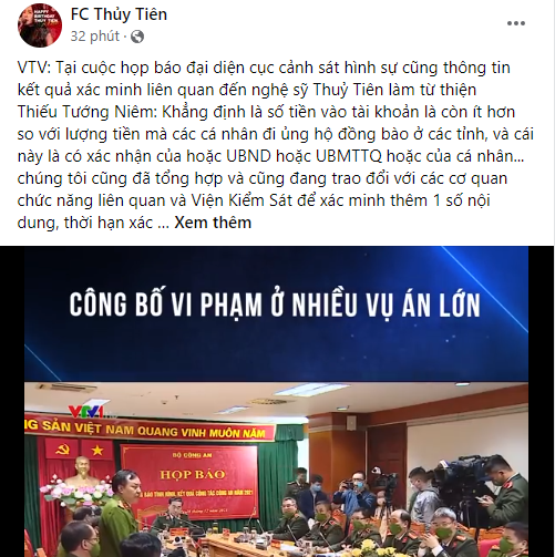 "VTV: Tại cuộc họp báo đại diện cục cảnh sát hình sự cũng thông tin kết quả xác minh liên quan đến nghệ sĩ Thuỷ Tiên làm từ thiện, thiếu tướng Niêm: Khẳng định là số tiền vào tài khoản là còn ít hơn so với lượng tiền mà các cá nhân đi ủng hộ đồng bào ở các tỉnh, và cái này là có xác nhận của hoặc UBND hoặc UBMTTQ hoặc của cá nhân... Chúng tôi cũng đã tổng hợp và cũng đang trao đổi với các cơ quan chức năng liên quan và Viện Kiểm Sát để xác minh thêm 1 số nội dung, thời hạn xác minh thì cũng đến 15.1 thì cũng là kết thúc”, phía Thủy Tiên chia sẻ.