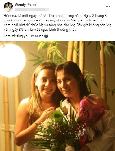 Vì thường xuyên sống ở nước ngoài cho nên Wendy gần như không quá để tâm vào ngày 8/3, tuy nhiên vì đó là sở thích của mẹ nên cô đã luôn chú ý vào ngày lễ này để gửi lời chúc đến Phi Nhung cũng như tặng quà cho mẹ vui.