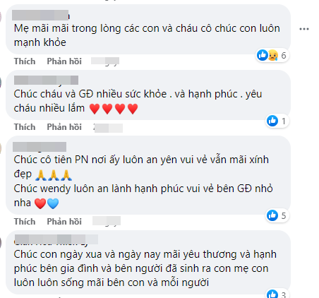 Đau xót hơn khi câu nói cuối cùng của cô chạm vào trái tim người hâm mộ. Cô cho biết bây giờ không còn mẹ nữa nên ngày 8/3 đối với cô chỉ là một ngày bình thường như bao ngày. Chỉ một câu nói ngắn nhưng thể hiện được tình cảm sâu đậm mà Wendy dành cho cố ca sĩ Phi Nhung.
