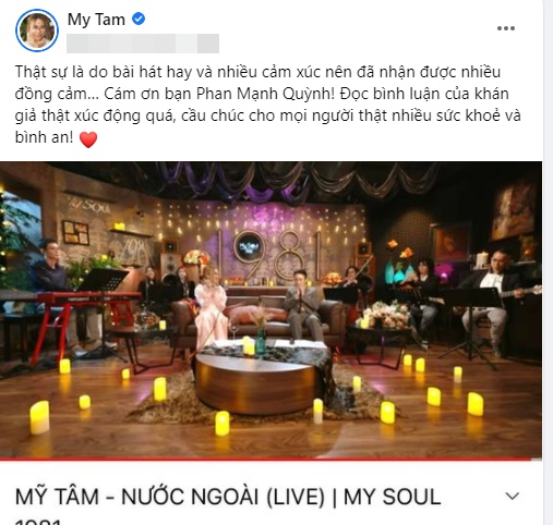 Mới đây, nữ ca sĩ Mỹ Tâm gây sốt cộng đồng mạng khi thông báo tin vui trên trang cá nhân của mình. Theo đó cô cho biết: Thật sự là do bài hát hay và nhiều cảm xúc nên đã nhận được nhiều đồng cảm… Cám ơn bạn Phan Mạnh Quỳnh! Đọc bình luận của khán giả thật xúc động quá, cầu chúc cho mọi người thật nhiều sức khoẻ và bình an”.