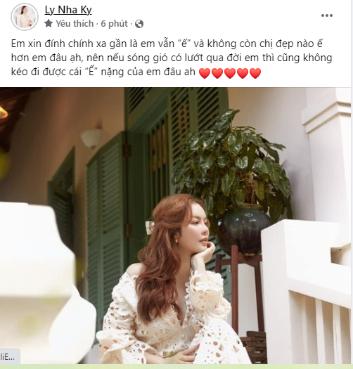 Trên trang cá nhân, Lý Nhã Kỳ khẳng định: "Em xin đính chính xa gần là em vẫn “ế” và không còn chị đẹp nào ế hơn em đâu ạ, nên nếu sóng gió có lướt qua đời em thì cũng không kéo đi được cái “ế” nặng của em đâu ạ".