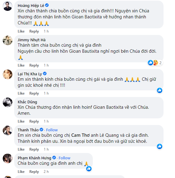 Dưới bài đăng của Cam Thơ, nhiều sao Việt như ca sĩ Thanh Thảo, Kha Ly, Đan Kim, nhà báo Song Minh,… đã gửi lời chia buồn sâu sắc nhất tới gia đình nữ ca sĩ.
