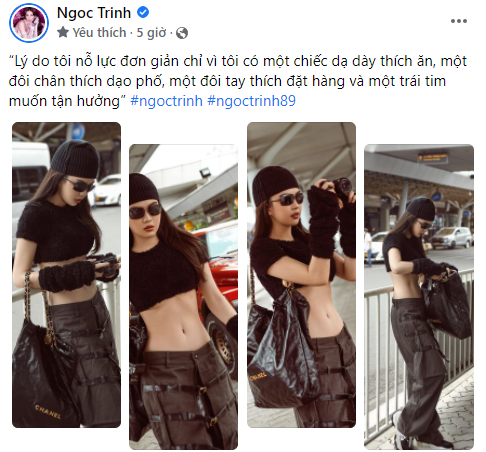 Nguyên văn dòng trạng thái của Ngọc Trinh: “Lý do tôi nỗ lực đơn giản chỉ vì tôi có một chiếc dạ dày thích ăn, một đôi chân thích dạo phố, một đôi tay thích đặt hàng và một trái tim muốn tận hưởng”.