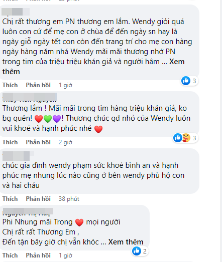 - Nhìn thấy rất cảm động. Mẹ Phi Nhung Phạm sẽ rất hạnh phúc nơi xa. Gì có cô con gái Wendy Phạm tuyệt vời. Hiếu thảo. Khán giả luôn nhớ về Phi Nhung Phạm dù em đã đi xa...