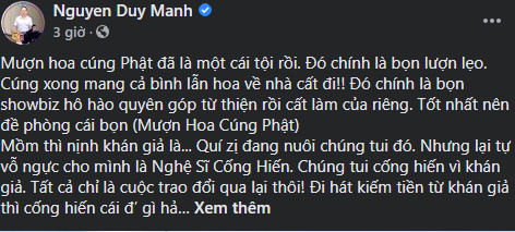 Giữa những ồn ào đó, ca sĩ Duy Mạnh đã có những chia sẻ của bản thân mình. Nam ca sĩ vốn là một người nổi tiếng thẳng tính, nghĩ gì nói đó. Anh ẩn dụ việc nghệ sĩ hô hào quyên góp như việc mượn hoa cúng phật rồi mang về nhà cất làm của riêng. Thậm chí, Duy Mạnh thẳng thắn chỉ trích đó là hành động lươn lẹo và tốt nhất là phải đề phòng, cảnh giác.