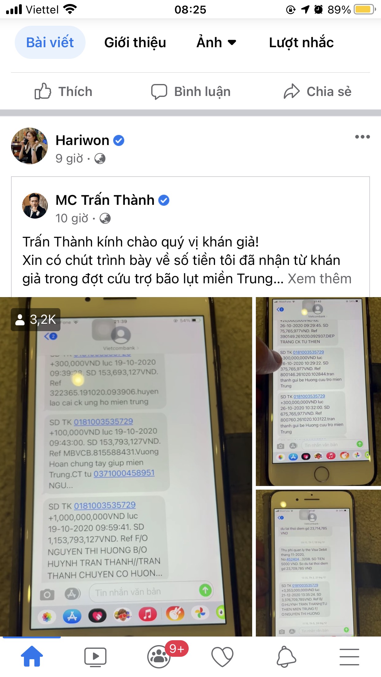 Sau đó Hari Won đã công khai chia sẻ bài viết trần tình khoản từ tiền từ thiện miền Trung của “A Xìn”. Tuy đăng lên không kèm với bất cứ dòng trạng thái nào nhưng cô và chồng nhận được sự tán dương của CĐM khi đã nhanh chóng lên tiếng. Một số bình luận tích cực dưới bài viết của cô như: “Cách giải quyết nhanh gọn lẹ, đáng khen ngợi”, “Em tin tưởng anh Trấn Thành”, “Đấy phản hồi nhanh như này, tránh để lâu mọi người nghi ngờ”.