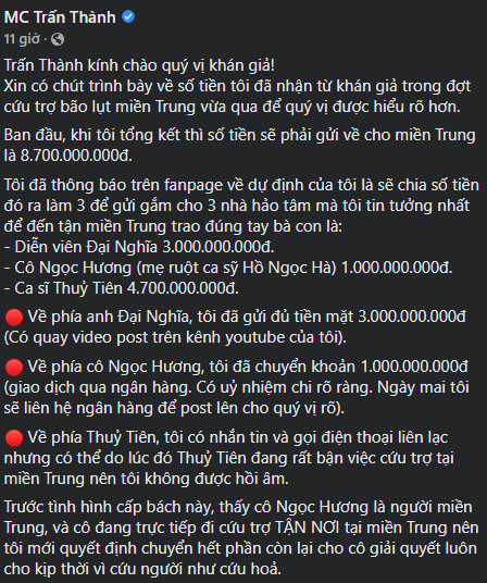 Đến tối 26/5, Trấn Thành đã có lên tiếng chi tiết về số tiền cứu trợ miền Trung mà anh đứng ra kêu gọi, cụ thể: “Khi tôi tổng kết thì số tiền sẽ phải gửi về cho miền Trung là 8.700.000.000đ. Tôi đã thông báo trên fanpage về dự định của tôi là sẽ chia số tiền đó ra làm 3 để gửi gắm cho 3 nhà hảo tâm mà tôi tin tưởng nhất để đến tận miền Trung trao đúng tay bà con là: Diễn viên Đại Nghĩa (3 tỷ đồng), cô Ngọc Hương -–mẹ ruột ca sỹ Hồ Ngọc Hà (1 tỷ đồng), ca sĩ Thủy Tiên (4,7 tỷ dồng)."