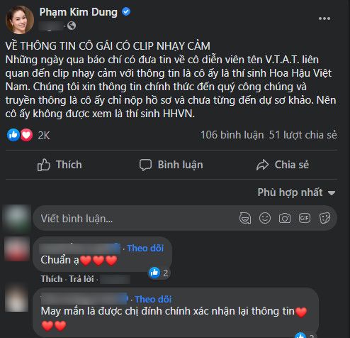 Bà Dung có chia sẻ như sau: “Những ngày qua báo chí có đưa tin về cô diễn viên tên V.T.A.T. liên quan đến clip nhạy cảm với thông tin là cô ấy là thí sinh Hoa Hậu Việt Nam. Chúng tôi xin đính chính là cô ấy chỉ nộp hồ sơ và chưa từng đến dự sơ khảo nên cô ấy không được xem là thí sinh HHVN".