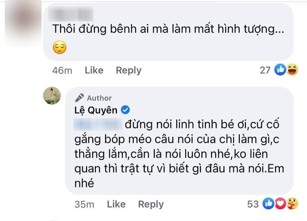 Bài đăng của "nữ hoàng phòng trà" nhanh chóng nhận được sự chú ý của CĐM. Nhiều người cho rằng cô đang ẩn ý về những sự việc đang xảy ra trong showbiz. Ngay lập tức, Lệ Quyên đã giải đáp các nghi vấn từ khán giả, cô cho biết đây chỉ là tâm tư riêng, mọi người không nên suy luận phức tạp hay bóp méo sự thật sang chiều hướng khác.