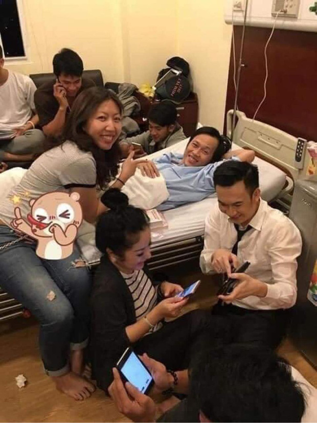 Trong bức ảnh, NS Hoài Linh nằm trên giường bệnh với gương mặt xanh xao nhưng vẫn tươi cười khi chụp hình cùng đàn em trong showbiz. Một số nghệ sĩ đã đến thăm và động viên anh như Dương Triệu Vũ, danh hài Thúy Nga,… Người đăng tải bức hình này còn đính kèm chú thích: “Chú Hoài Linh mau khỏe nha, bà con đợi chú đấy”.
