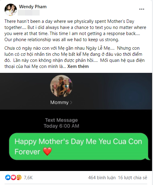 Trên trang cá nhân của mình, Wendy Phạm đã đăng tải hình ảnh tin nhắn cô dành cho mẹ mình nhân ngày quan trọng. Đính kèm với đó Wendy Phạm đã để lại dòng trạng thái bằng cả tiếng Việt và tiếng Anh: “There hasn’t been a day where we physically spent Mother’s Day together…. But i did always have a chance to text you no matter where you were at that time. This time I am not getting a response back…. Our phone relationship was all we had to keep us strong.