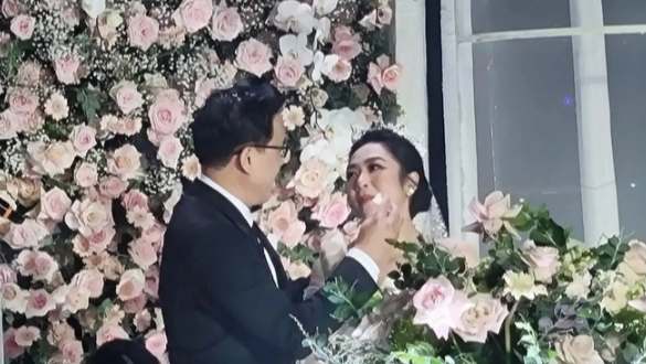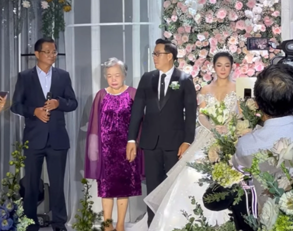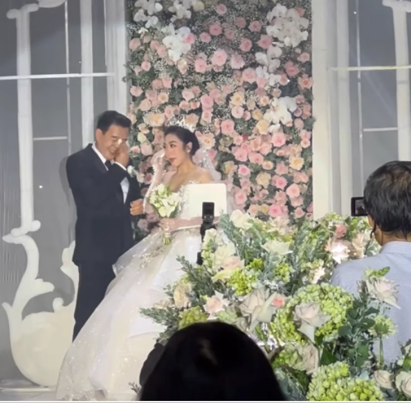 Trong giây phút được chú rể đỡ tay từ bố ruột dắt lên sân khấu, Hà Thanh Xuân đã không kìm được nước mắt và bật khóc vì xúc động. Thắng Ngô phải lấy khăn lau nước mắt cho vợ.