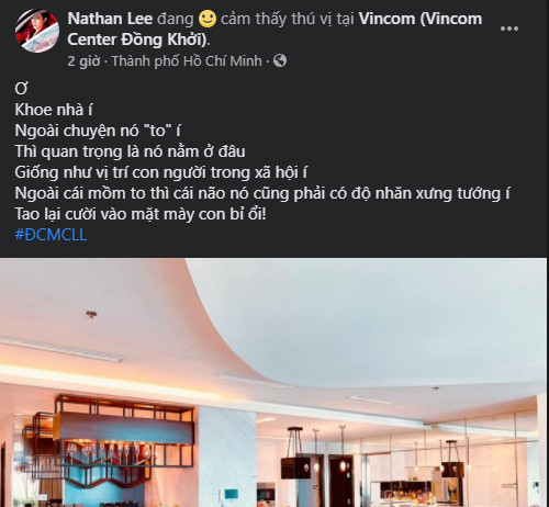 Mới đây, trên trang cá nhân của Nathan Lee bất ngờ có chia sẻ gây xôn xao dư luận. Cụ thể anh chàng ẩn ý nói về việc khoe nhà cửa của một nhân vật ẩn danh nào đó. Nathan Lee cho rằng dù nhà cửa có to đến đâu nhưng yếu tố quan trọng nhất của nó vẫn là vị trí được xây dựng.