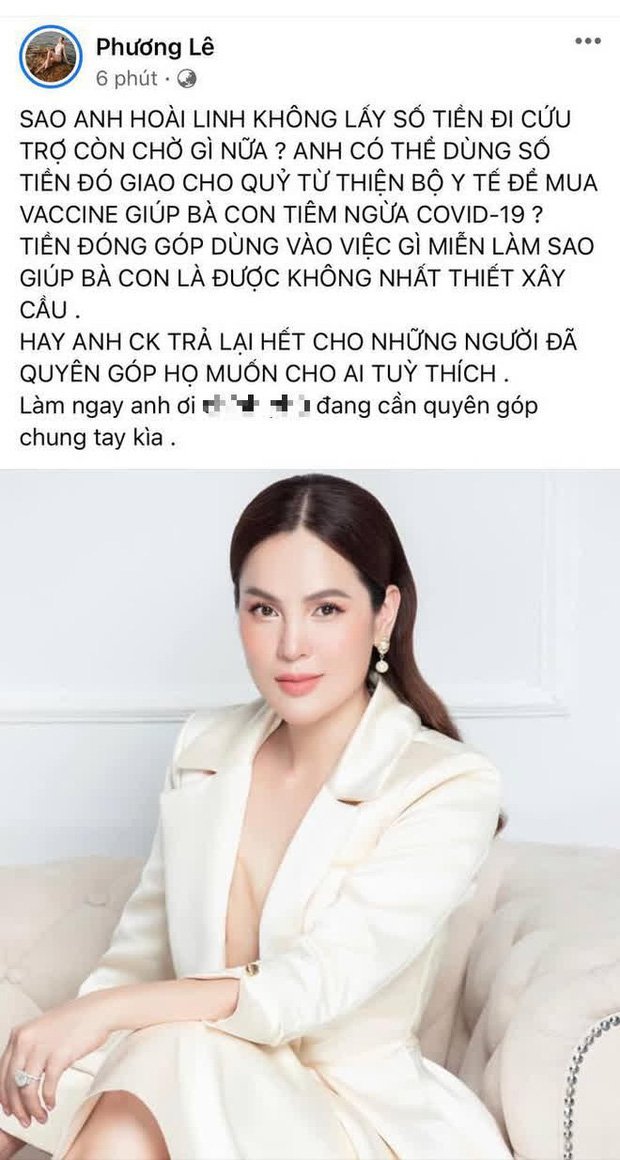 Trước khi đứng ra nói Phi Nhung, Hoa hậu Phương Lê đã không hài lòng vì sự chậm trễ của nam danh hài trong vấn đề hơn chục tỷ từ thiện. Cô còn thẳng thắn cho rằng vì sao đến lúc này Hoài Linh không chuyển tiền để mua vaccine cho người dân, từ thiện cuối cùng cũng là mục đích giúp người dân. Còn nếu không hay trả lại hết tiền cho những người đã ủng hộ, sau đó họ muốn cho ai là tùy thích.