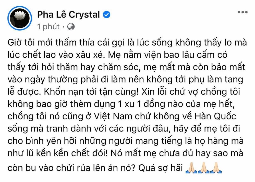 Pha Lê gọi thẳng đối tượng đề cập đến trong bài viết này chính là họ hàng nhà ông xã người Hàn Quốc. Trước những sự việc xảy ra, cô tâm sự đã thấm thía được cái gọi là lúc sống không thấy lo mà vừa nhắm mắt đã lao vào xâu xé. Thời điểm mẹ của ông xã nằm bệnh viện không ai đến hỏi thăm hay chăm sóc, đến tận khi bà qua đời họ cũng lấy lý do ngày thường bận đi làm để không phụ tang. Cô cho rằng đó là sự "khốn nạn đến tận cùng".