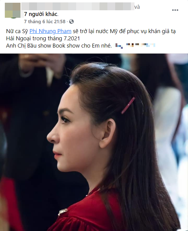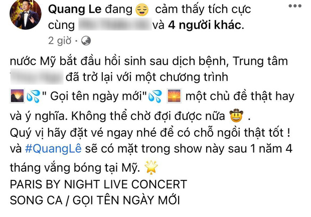 Đặc biệt, Quang Lê còn bất ngờ để lộ chi tiết chứng minh Phi Nhung sẽ về Mỹ trong tháng 7-8 tới đây. Cụ thể anh đăng lên trang cá nhân dòng trạng thái: “Nước Mỹ bắt đầu hồi sinh sau dịch bệnh, Trung tâm *** *** đã trở lại với một chương trình Gọi tên ngày mới, chủ đề thật hay và ý nghĩa. Không thể chờ đợi được nữa. Quý vị hãy đặt vé ngay nhé để có chỗ ngồi thật tốt! và Quang Lê sẽ có mặt trong show này sau 1 năm 4 tháng vắng bóng tại Mỹ”.