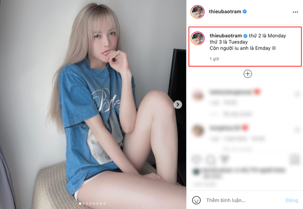 "Thứ 2 là Monday. Thứ 3 là Tuesday. Còn người yêu anh là Emday", nữ ca sĩ viết. Ngay lập tức, cư dân mạng đổ xô và để lại bình luận dưới bài viết của cô, hết gọi tên "trà xanh" lại "tuesday", thậm chí còn nhắc hẳn tới tên Hải Tú. Drama nghi vấn Sơn Tùng và Thiều Bảo Trâm chia tay sau 8 năm hẹn hò vì Hải Tú một lần nữa xôn xao trở lại.