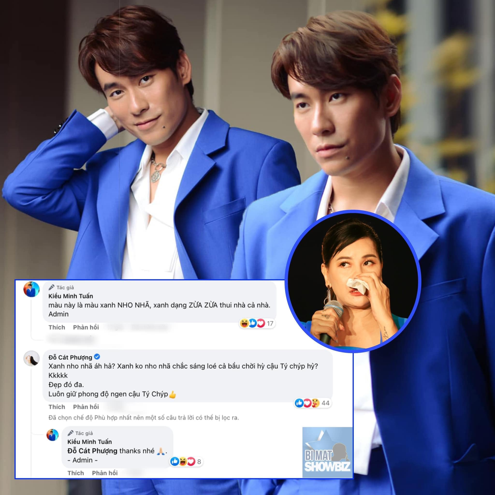 Theo đó Cát Phượng bình luận: “Xanh nho nhã ấy hả. Xanh không nho nhã chắc sáng loé cả bầu trời cậu Tý Chýp nhỉ? Đẹp đó ha. Luôn giữ vững phong độ nghen cậu Tý Chýp". Trả lời bạn gái cũ, Kiều Minh Tuấn chỉ để lại câu cảm ơn ngắn gọn.