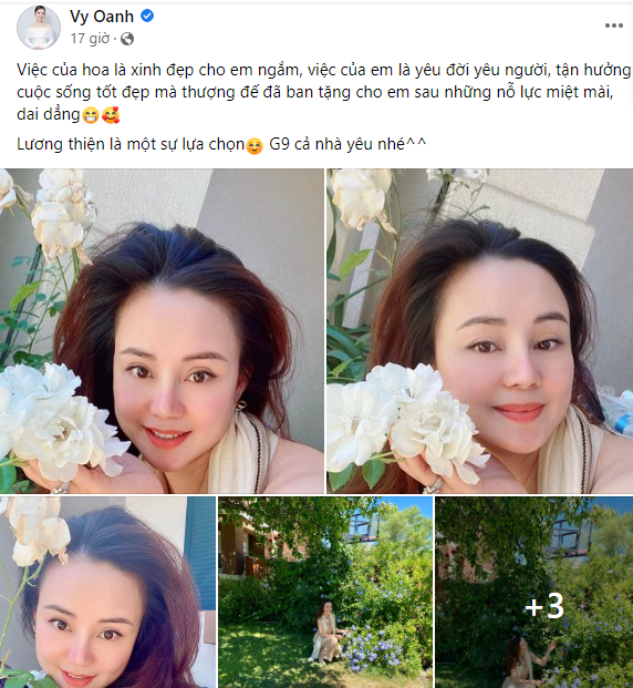 Sau khi thông tin bà Nguyễn Phương Hằng bị tạm giam thêm 2 tháng nhằm phục vụ công tác điều tra được dư luận truyền tai nhau, nhiều người không khỏi tò mò về động thái của Vy Oanh. Theo đó cô đã có bài đăng mới nhất trên trang cá nhân, nguyên văn đoạn chia sẻ: “Việc của hoa là xinh đẹp cho em ngắm, việc của em là yêu đời yêu người, tận hưởng cuộc sống tốt đẹp mà thượng đế đã ban tặng cho em sau những nỗ lực miệt mài, dai dẳng. Lương thiện là một sự lựa chọn. G9 cả nhà yêu nhé".