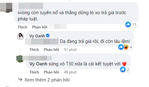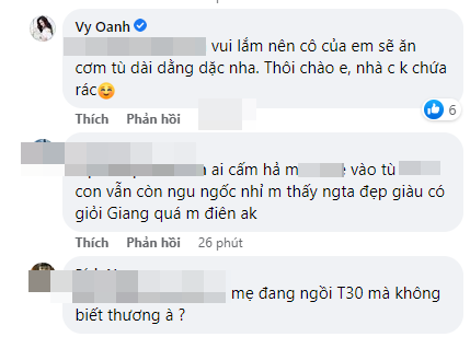 Duy nhất chỉ có một lần khi có người nhắc khéo đến bà Phương Hằng dưới bài đăng, Vy Oanh đã lên tiếng ‘dằn mặt’ mạnh mẽ. Theo đó người này để lại bình luận “Tiếp nhận hồ sơ, sáp nhập điều tra 2 vụ án liên quan đến bà Nguyễn Phương Hằng”. Vy Oanh liền đáp lại gay gắt: “Không ai cấm mơ, cứ mơ đi cho đời cho phép kkk, não bị nghẹt không thông được tội quá nhỉ”. Bên dưới cô tiếp tục nhắc đến nữ CEO: “Vui lắm nên cô của em sẽ ăn cơm tù dài dằng dặc nha. Thôi chào em, nhà chị không chứa rác”.