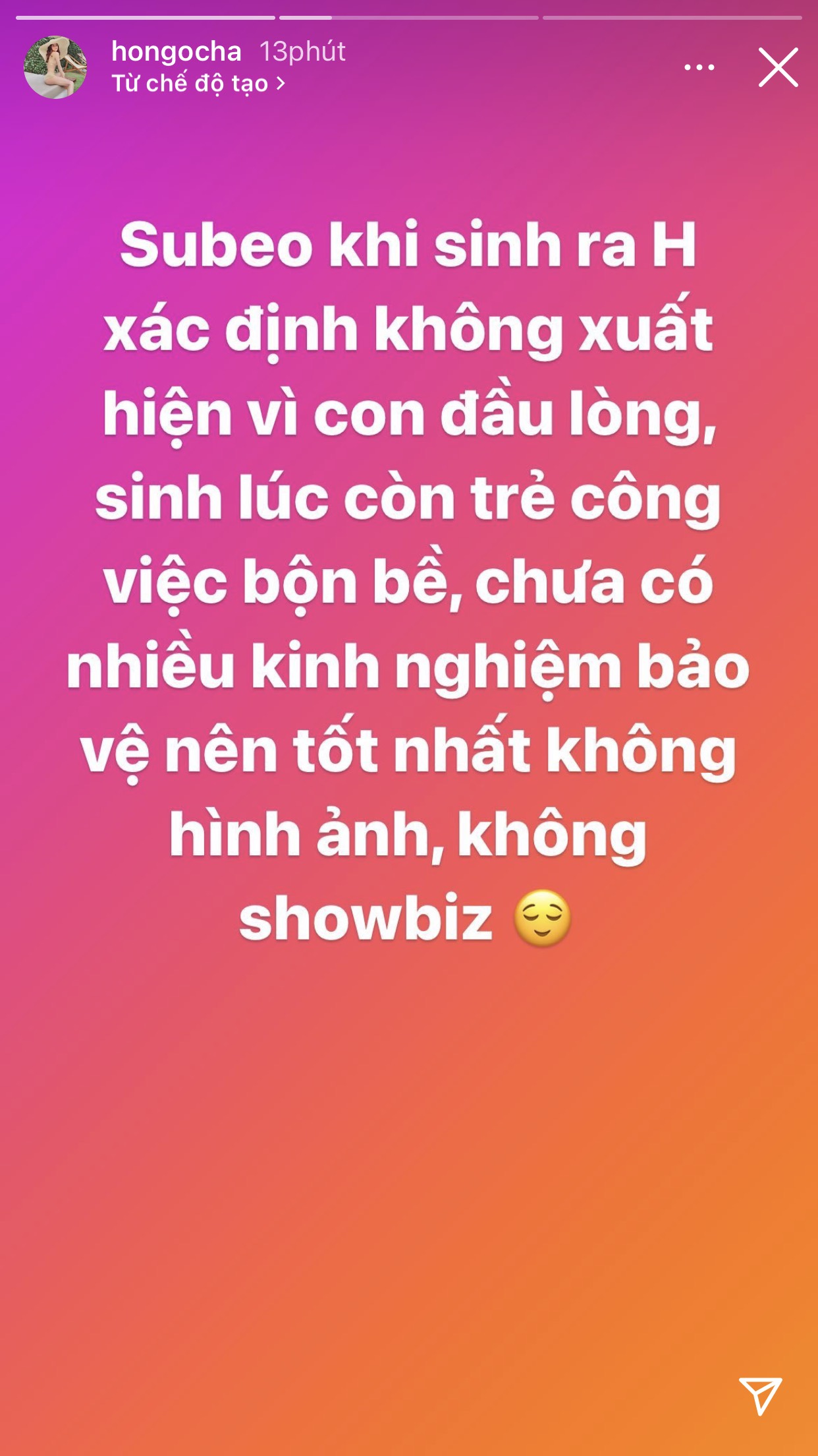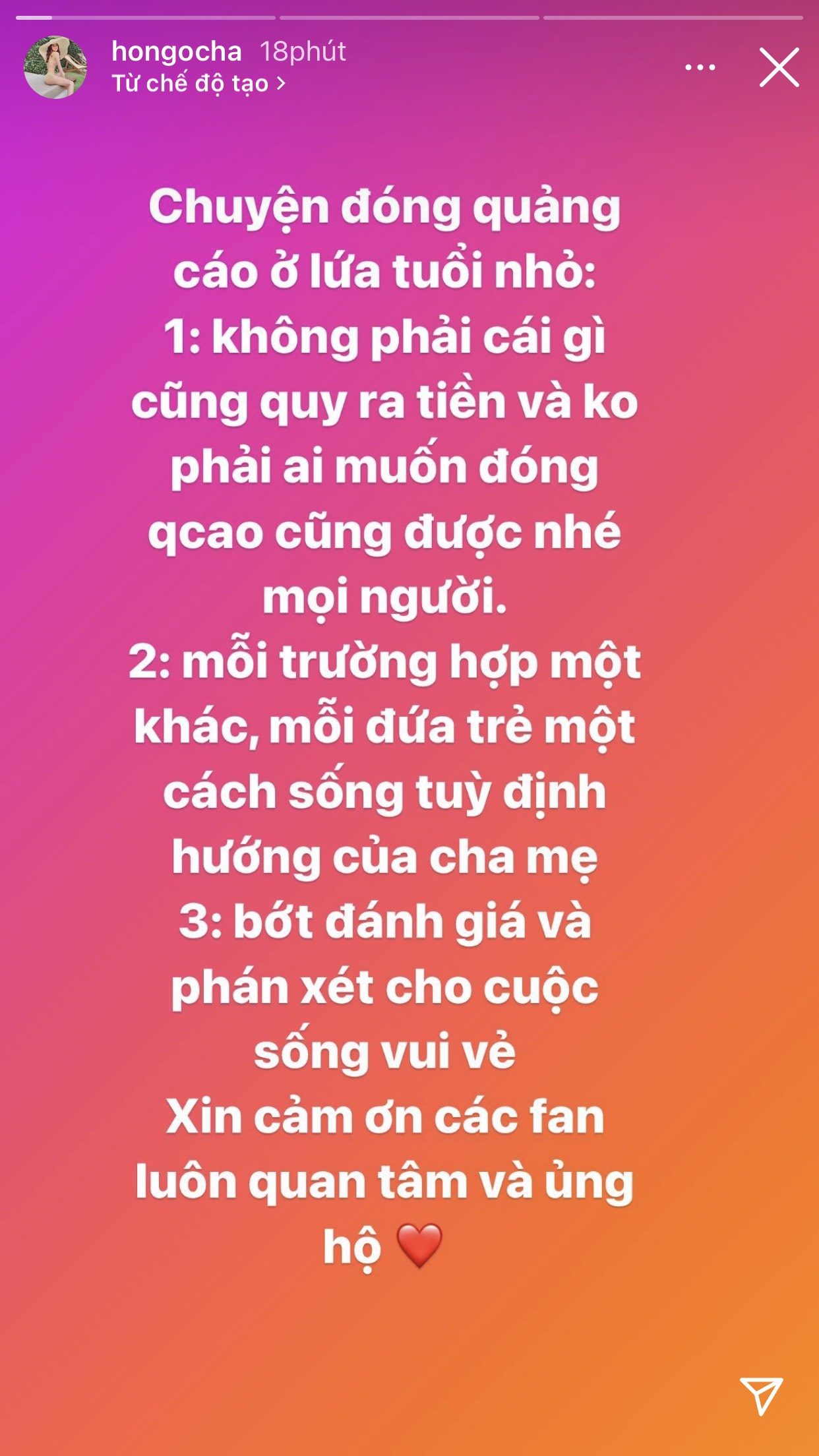 “Từ khi Chin thối cất tiếng khóc chào đời, em Thối đã nhận được vô số lời mời quảng cáo cho các nhãn hàng, kể mà để kiếm tiền thì em Thối cũng kiếm được ối tiền đấy. Nhưng ai lại thế nhỉ, tội em, hãy để tuổi thơ của em trong trẻo như tiếng cười của em. Từ quê nhà Lạng Sơn, bà ngoại cũng đã nói lời từ chối với một nhãn hàng rằng: “Các bác thông cảm, ba mẹ Chin không cho Chin nhận quảng cáo đâu ạ”, yêu em”, Đàm Thu Trang chia sẻ.