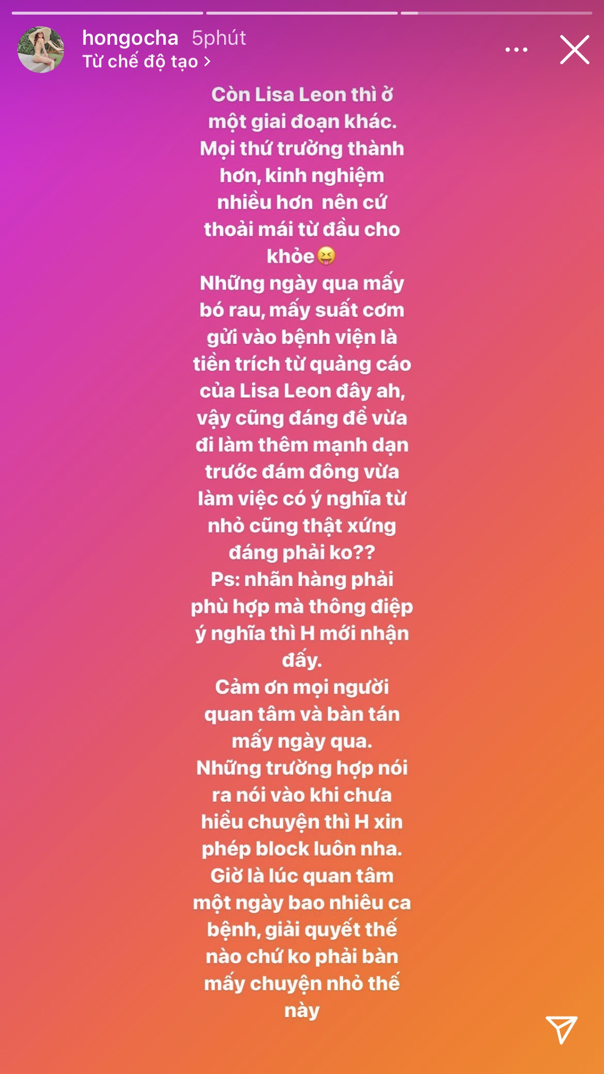 Cuối cùng, Hồ Ngọc Hà thẳng thắn cho biết sẽ thẳng tay chặn những thành phần cũng như ý kiến tiêu cực nhằm vào gia đình cô. Có thể thấy đây là một hành động đúng đắn và khôn ngoan của Hồ Ngọc Hà nhằm bảo vệ hai thiên thần Lisa và Leon cũng như mái ấm gia đình của mình.