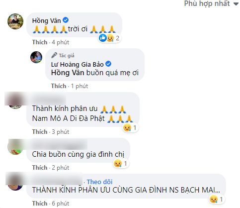 Ngay khi nhận được tin buồn, nhiều người đã bày tỏ sự tiếc thương trước sự ra đi của nữ nghệ sĩ Kim Phượng. NSND Hồng Vân cũng bàng hoàng khi nhận tin dữ từ "con trai Hoài Linh”, nam diễn viên dường như cũng hiểu được nỗi lòng của Hồng Vân và chỉ có thể động viên cô cố gắng vượt qua nỗi đau tinh thần.
