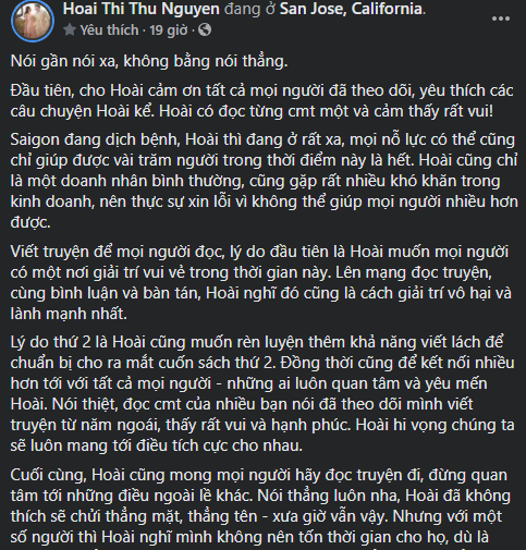 Trong bài đăng, nữ doanh nhân cảm ơn người hâm mộ đã theo dõi, yêu thích những câu chuyện mình kể. Cô cho biết bản thân là một doanh nhân bình thường như bao người khác nên vào thời điểm này, nàng Hậu cũng gặp khó khăn về kinh doanh, tài chính.