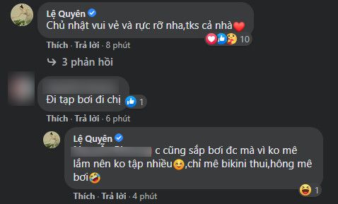 Rất nhanh chóng, bài đăng của Lệ Quyên đã thu hút sự quan tâm của đông đảo người hâm mộ với lượt tương tác tăng nhanh chóng mặt. Ngay dưới phần bình luận, người hâm mộ liên tục dành “cơn mưa lời khen” cho nữ ca sĩ: “Đẹp quá, chúc chị cuối tuần vui vẻ”, “Đi tập bơi đi Quyên ơi, đẹp quá”, “Mê chữ ê kéo dài”.