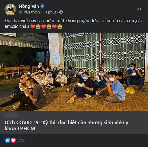 NSND Hồng Vân cũng chia sẻ về vấn đề này: “Đọc bài viết này sao nước mắt không ngăn cản được…cảm ơn các con, các em, các cháu.”. Có thể thấy được Hồng Vân vô cùng xúc động trước những nghĩa cử cao đẹp của đội tình nguyện viên sinh viên y TP.HCM. Dù có khó khăn, vất vả, những nam thanh nữ tú của sinh viên y khoa TP.HCM vẫn sẵn sàng đi ra tiền tuyến phòng chống dịch bệnh. Mặc cho có khó khăn, nguy hiểm đến tính mạng, nhưng khi tổ quốc kêu gọi, các bạn trẻ vẫn sẵn sàng hành động.
