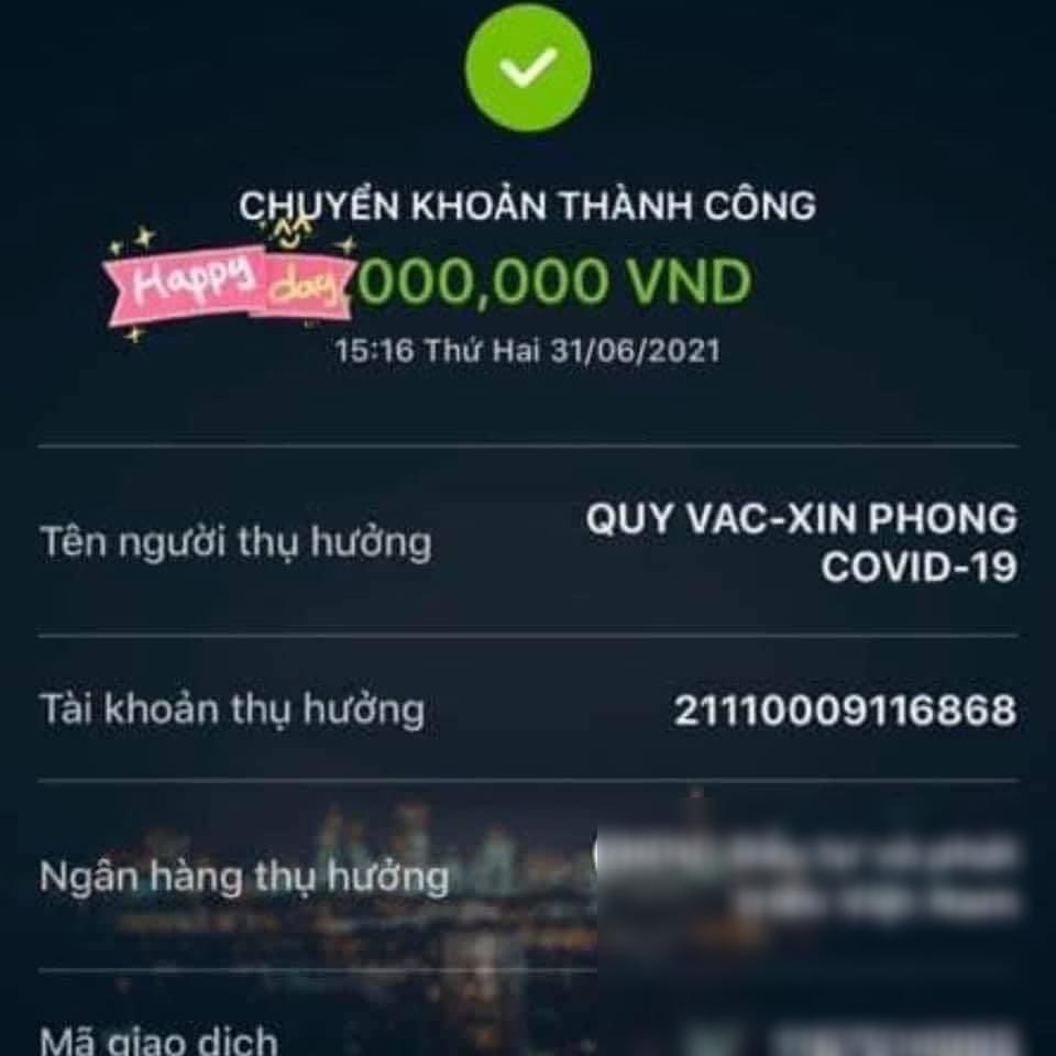 Vào ngày 31/05, ca sĩ Vy Oanh đăng tải hình ảnh chụp màn hình khoản tiền chuyển khoản ủng hộ Quỹ vaccine phòng chống Covid. Điều đáng nói ở đây là cư dân mạng đã tinh mắt soi ra bức ảnh đáng ngờ khi có ngày chuyển là 31/06/2021 (không tồn tại).