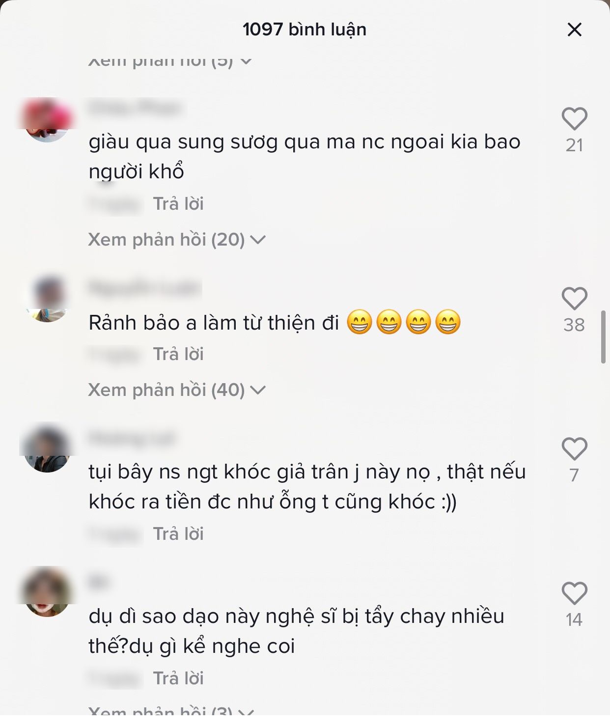 Thậm chí, nhiều người còn bới móc ồn ào cũ của nam anh ra để chê bai, dè bỉu. Cụ thể, một tài khoản cho biết: “Đang dịch như thế này, không biết Trấn Thành có kêu anh HL14 đi kêu gọi từ thiện nữa không”, dù không nhắc trực tiếp đến một cá nhân nào nhưng nhiều người ngầm hiểu nhân vật này đang nói đến Hoài Linh và chuyện từ thiện của nghệ sĩ.