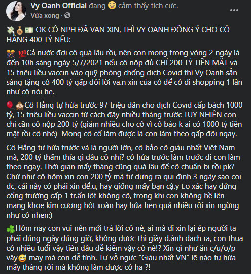 Vy Oanh cho biết: "Ok cô đã van xin thì Vy Oanh đồng ý cho cô 400 tỷ nếu: Cả nước đợi cô quá lâu rồi, nên con mong trong vòng 2 ngày là đến 10h sáng ngày 5/7/2021 nếu cô nộp đủ chỉ 200 tỷ tiền mặt và 15 triệu liều vaccine vào quỹ phòng chống dịch Covid thì Vy Oanh sẵn sàng tặng cô 400 tỷ gấp đôi lời van xin của cô để cô đi shopping 1 lần như cô nói he".
