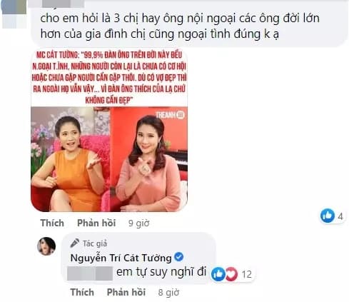 Người dùng mạng này cho biết: “Thưa cô, cô lớn tuổi hơn cháu mà thở ra câu thối hơn cả nhân cách cháu". Đáp trẻ lại bình luận trên, Cát Tường nói: “Cha chú gì cũng là đàn ông con nhé”.