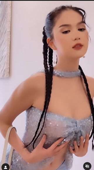 Chiếc áo được Ngọc Trinh lựa chọn có thiết kế chỉ đủ che chắn phần ngực và hoàn toàn không có đồ bảo hộ bên trong, Chất liệu vải xuyên thấu khiến cô nàng để lộ ra bầu ngực nõn nà trước ống kính.