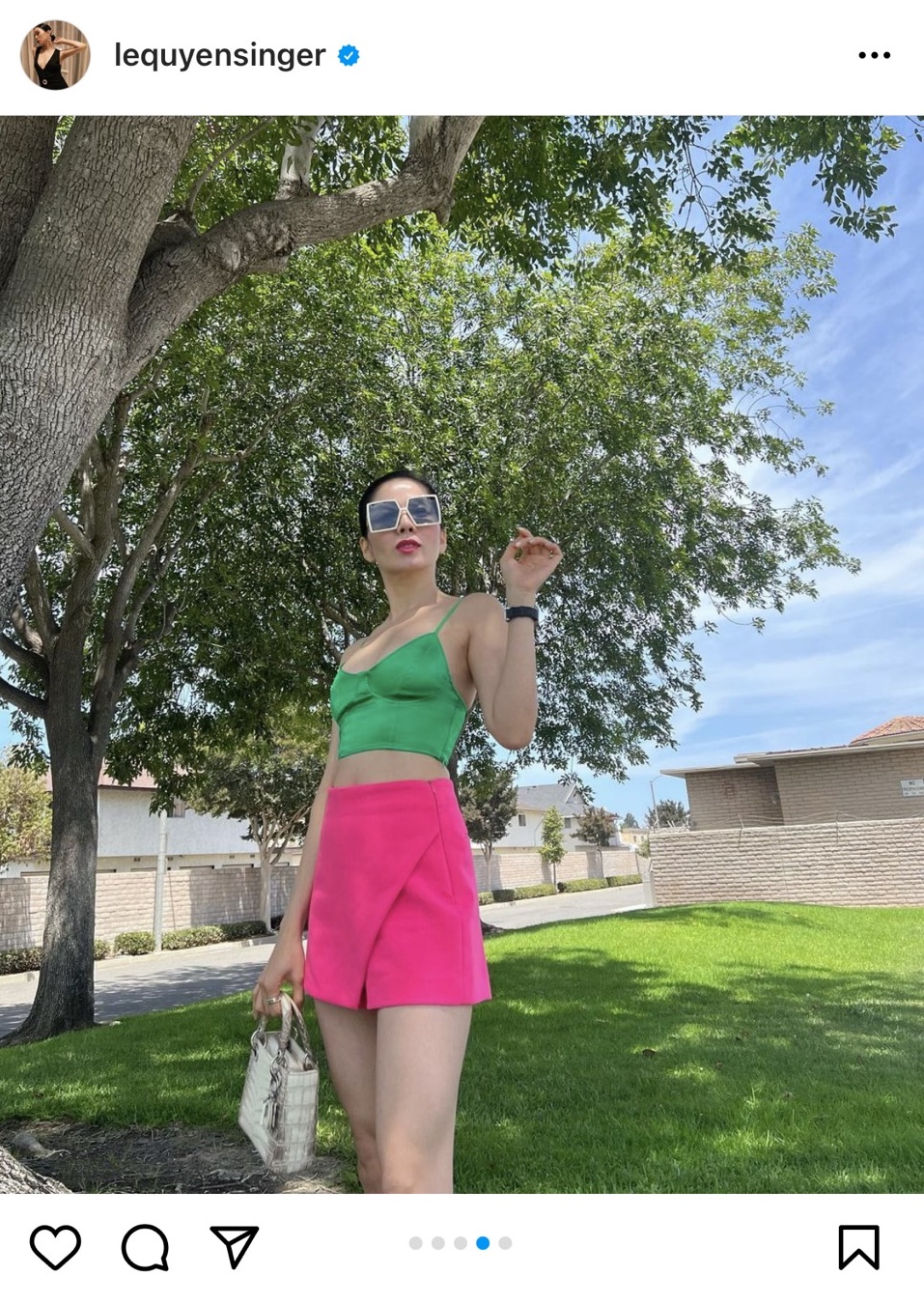 Mới đây khán giả tiếp tục trầm trồ trước hình ảnh mới được Lệ Quyên đăng tải trên trang cá nhân. Theo đó nữ ca sĩ đã đăng tải loạt ảnh mới tạo dáng khi dạo phố. Trong lần xuất hiện này Lệ Quyên diện bộ đồ với tông màu xanh hồng nổi bật, bộ đồ giúp cô nàng tôn lên vóc dáng khỏe khoắn và săn chắc của mình dù đã ở độ tuổi tứ tuần.