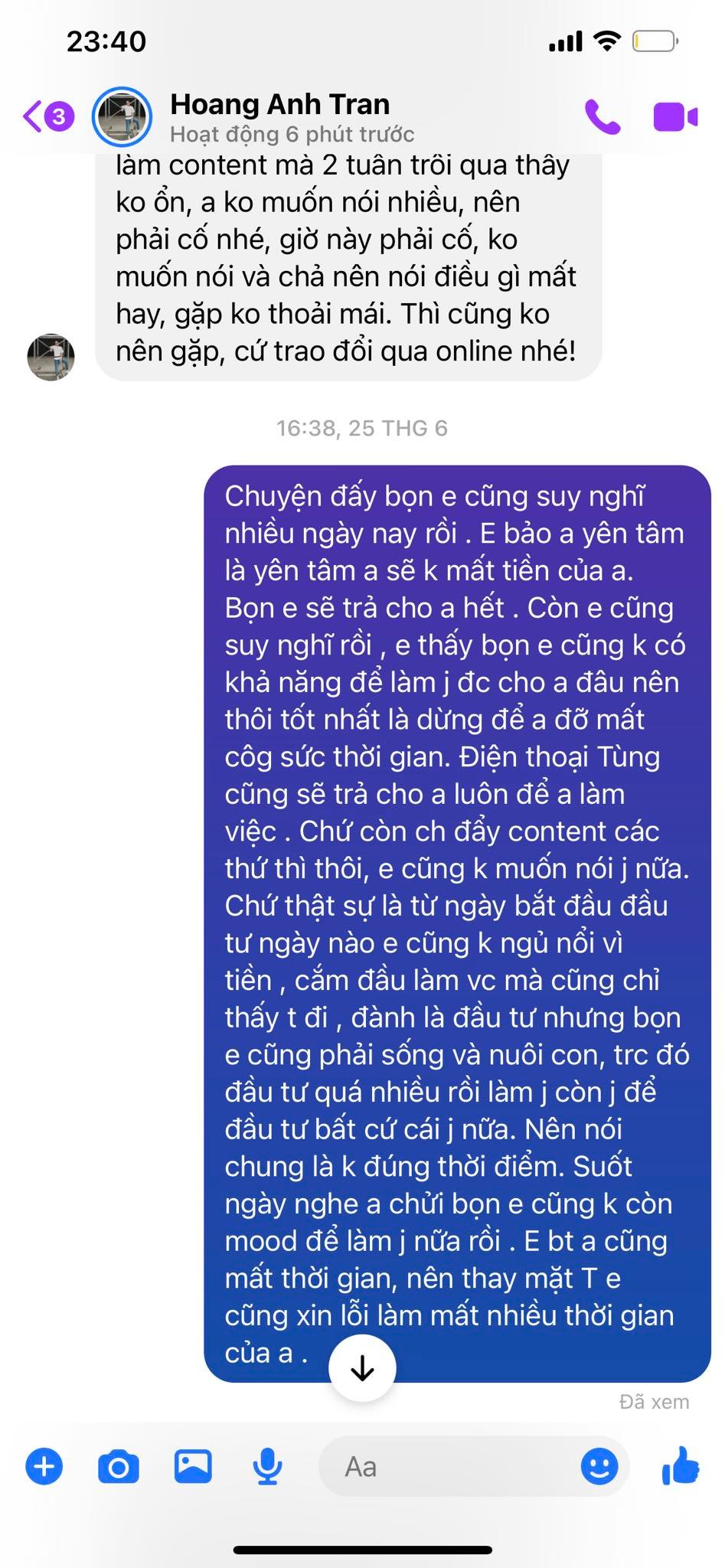 Nói chung, Tùng vẫn nghĩ, khi viết những dòng này, sẽ vẫn rất nhiều người thấy Tùng không đáng tin và trông có vẻ cốt đột, lông bông. Nhưng thật sự Tùng không có rành về truyền thông, không có nhiều mối quan hệ, thật sự là một kẻ thấp cổ bé họng và gần như chẳng thể phản kháng lại bất kì bài báo, thông tin hay những đối tác đang làm việc với anh quản lý cũ. Vậy nên Tùng đã định giữ im lặng tới cuối cùng".