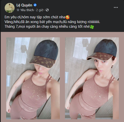 Cụ thể, Lệ Quyên đăng tải: “Em yêu ơi, hôm nay tập sớm chút nha". Nữ ca sĩ cũng ngọt ngào đáp: "Vâng, hihi, đã ăn xong bát yến mạch, đủ năng lượng rồi".