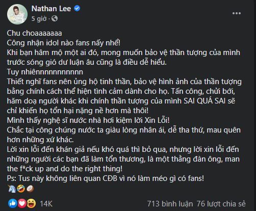 Mới đây, nam ca sĩ Nathan Lee bất ngờ lên tiếng nói về những vấn đề nổi cộm trên. Cụ thể anh cho biết, việc người hâm mộ bảo vệ thần tượng của mình là không sai, tuy nhiên cần nhìn nhận ở mặt vấn đề đúng hay sai. Nếu như thần tượng làm sai thì người đó phải xin lỗi người bị hại cũng như các bên liên quan.
