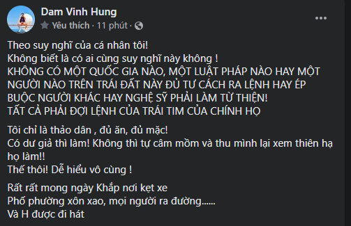 Mới đây, Đàm Vĩnh Hưng bất ngờ chia sẻ quan điểm cá nhân của mình xoay quanh vấn đề từ thiện. Cụ thể, nam ca sĩ cho rằng không một ai có quyền bắt ép người khác phải làm từ thiện trong bất kỳ một hoàn cảnh nào, vấn đề thiện nguyện phải xuất phát từ tâm của mỗi con người.